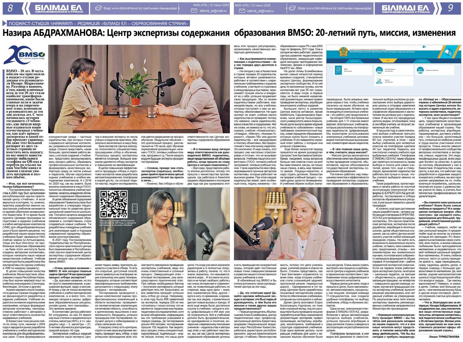 Республиканский Центр экспертизы содержания образования в этом году отмечает юбилей. Два десятка лет: своя история, своя летопись, свои важные значимые эпохи становления и развития во имя сферы образования Казахстана. Мы открывает постоянный раздел BMSO на нашем сайте и здесь всегда можно будет посмотреть подкаст, записанный с директором Центра Назирой Абдрахмановой и с представителями отечественных издательств. В честь юбилейной даты мы проводим серию подкастов и готовим Спецвыпуск в газете «Білімді ел – Образованная страна», который также разместим в этом разделе. Кроме того, каждый подкаст вместе с его кюар—кодом будет размещен в печатной виде на страницах газеты. Таким образом, цифровой след, посвященный 20-летию Центра и истории казахстанского издания учебников останется на память навсегда!