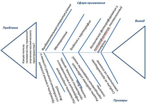 На уроке по теме «Красота Вселенной» (раздел «Космос») учащимся была предложена заполненная учителем схема Фишбоун, где голова (рыбы) отражала проблему, верхние кости – области и сферы применения космических исследований, нижние кости – соответствующие примеры. На основе информации несплошного текста учащимся предстояло рассказать о практической значимости изучения космоса и, сформулировав вывод одним предложением, заполнить хвостовую часть.