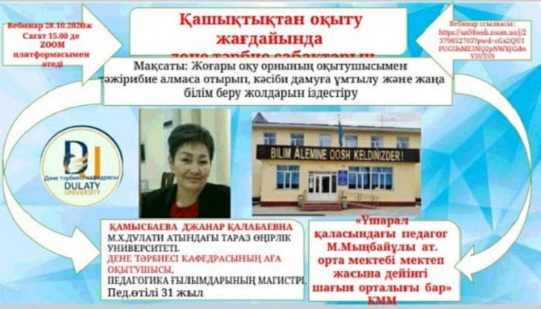 Вебинар мақсаты: «Жоғары оқу орны оқытушысымен тәжірибе алмаса отырып, кәсіби дамуға ұмтылу және жаңа білім беру жолдарын іздестіру». Вебинар барысында, тәжірибе алу мақсатында Жанар Қалабайқызының дене шынықтыру пәніне жасалған видео сабақтары көрсетіліп, көптеген сұрақтар және дене шынықтыру сабағын ұйымдастыру жайлы ой-пікірлер айтылды. Алдағы уақытта осы аталған мектептің дене тәрбиесі пәнінің мұғалімдерімен тығыз байланыста болып, өзара тәжірибе алмасу жайлы ұсыныс жасалды.