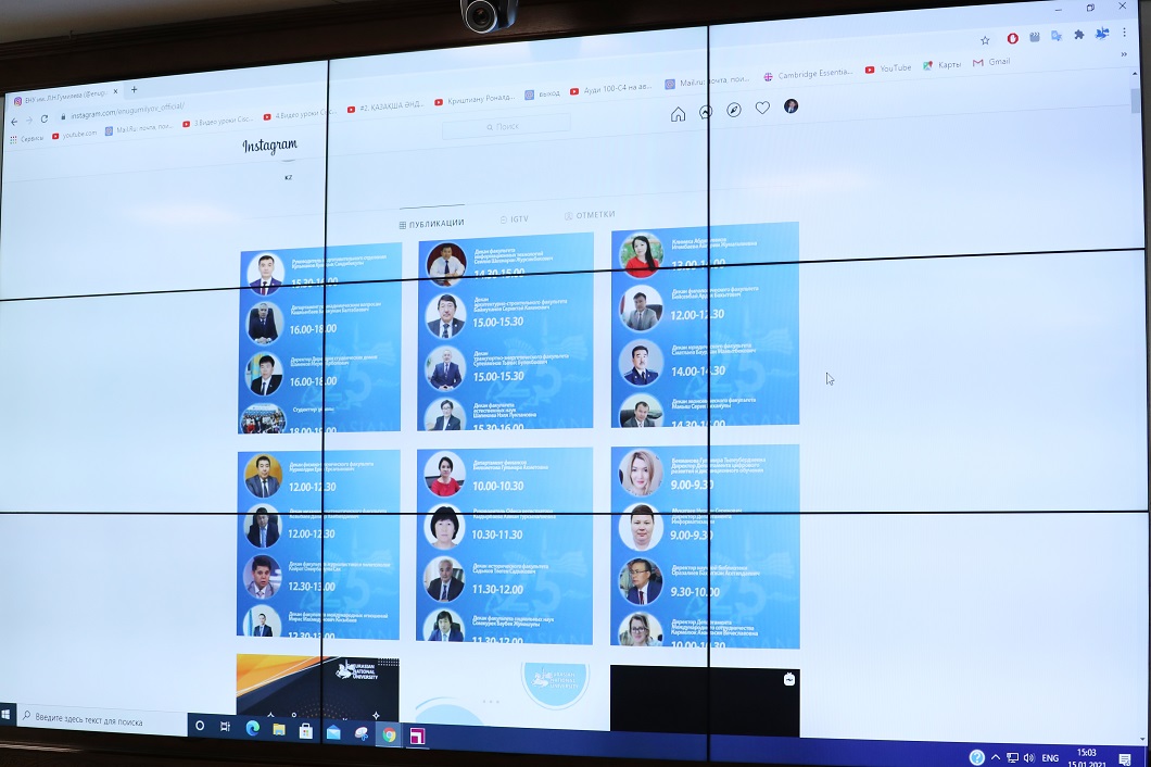 Л.Н. Гумилев атындағы Еуразия ұлттық университеті әлеуметтік желі арқылы, үзіліссіз он сағат тікелей эфир жүргізілді. Негізгі мақсат – студенттерге қазіргі оқу процесінің барысы мен жай-жапсары туралы толық ақпарат беру, – деп хабарлайды осы жоғары оқу орнының ақпарат орталығы.