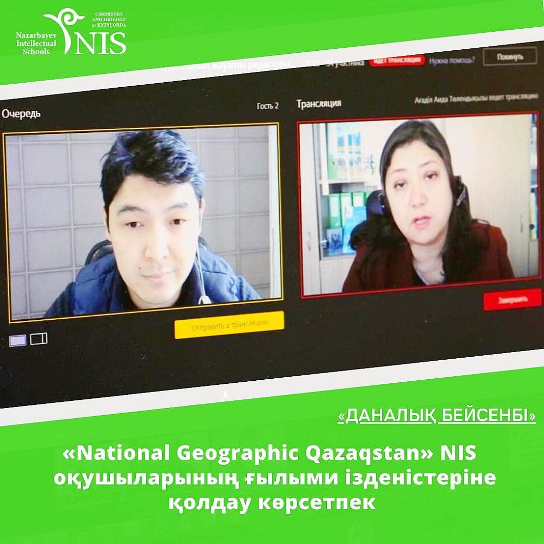 NIS оқушылары, ұстаздары мен ата-аналары кезекті «Даналық бейсенбіні» әйгілі «National Geographic» журналының еліміздегі өкілдерімен жүздесуге арнады. Қызылорда қаласындағы Назарбаев Зияткерлік мектебі «Даналық бейсенбі» жобасы аясында мемлекеттік тілде таралатын тұңғыш шетелдік басылым – «National Geographic Қазақстан» журналының жауапты редакторы Арай Ізбаймен онлайн кездесу ұйымдастырды, – деп хабарлайды осы білім ордасының баспасөз қызметі.