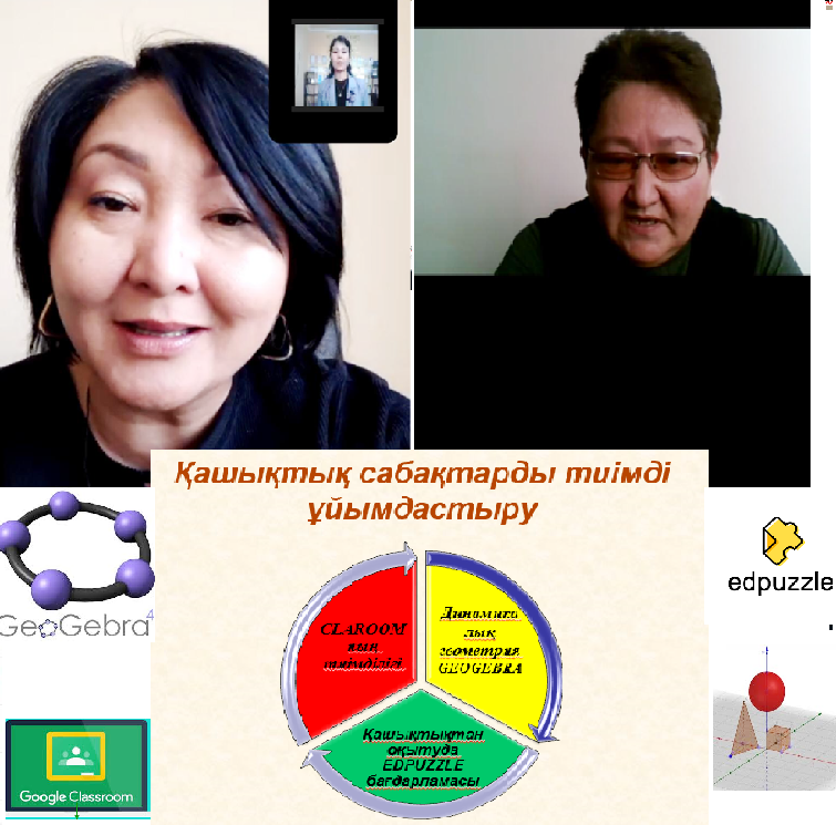GeoGebra.org/classic бағдарламасы геометрия (планиметрия және стереометрия) сабағында динамикалық сызбаларды жандандыру арқылы практикалық сабақтар өткізуге болады. Бұл оқушының кеңістіктік ойлау дағдысы мен шығармашылық тұрғыдан ойлайға, соның негізінде шешім қабылдауы және өмірмен байланыстыруға үйретеді. Edpuzzle ақпарттық платформасы қашықтан білім алушының жаңа тақырыпты түсінуінде, үй жұмысын орындауда, қайталау тақырыбын ұсынғанда таптырмас құрал, себебі, тек қана видеоматериалды көріп отырмай, оқушының қаншалықты дұрыс түсініп отырғандығына мұғалім тарапынан талдау жүргізіледі. Қалыптастырушы бағалау жүргізеді, оқушының білім алу динамикасын көрсетіп отырады.