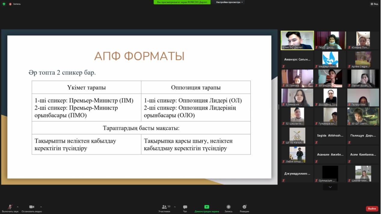 В столице подвели итоги городского дебатного турнира «Ұшқыр ой алаңы», организованного через онлайн платформу ZOOM, передает сайт Управления образования г. Нур-Султан.