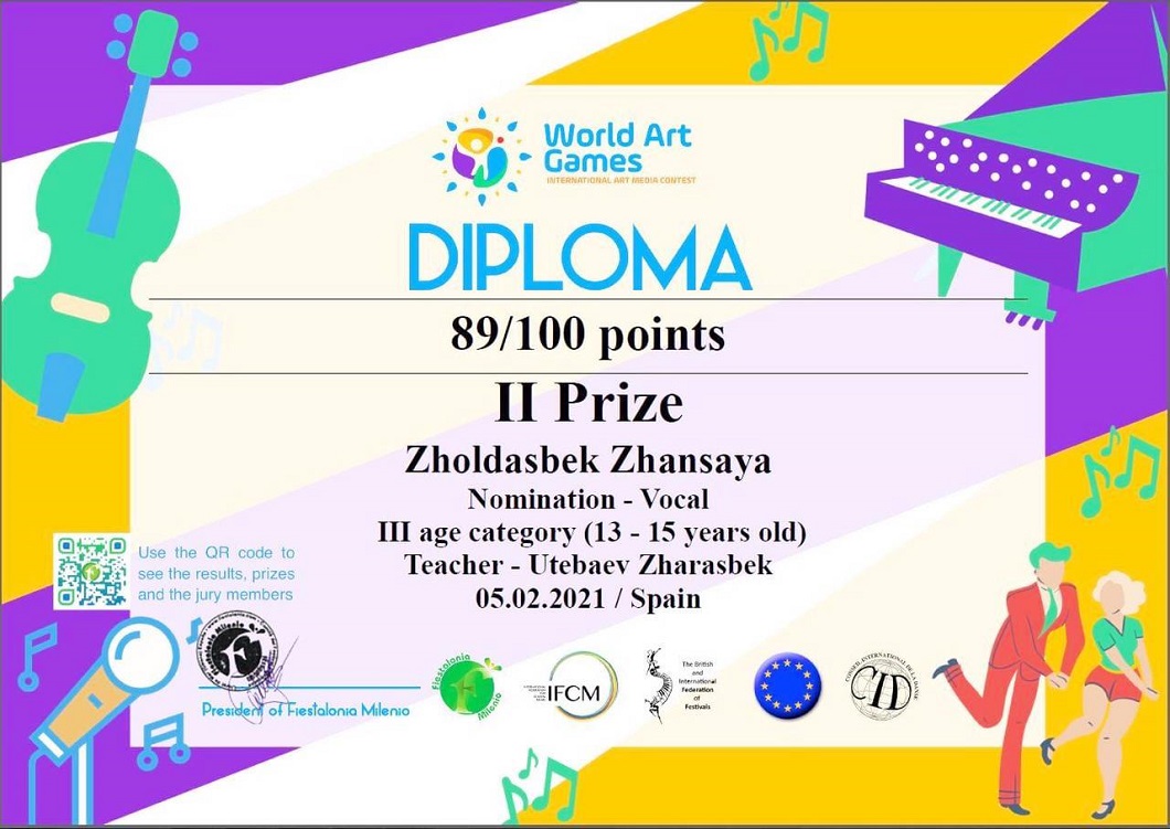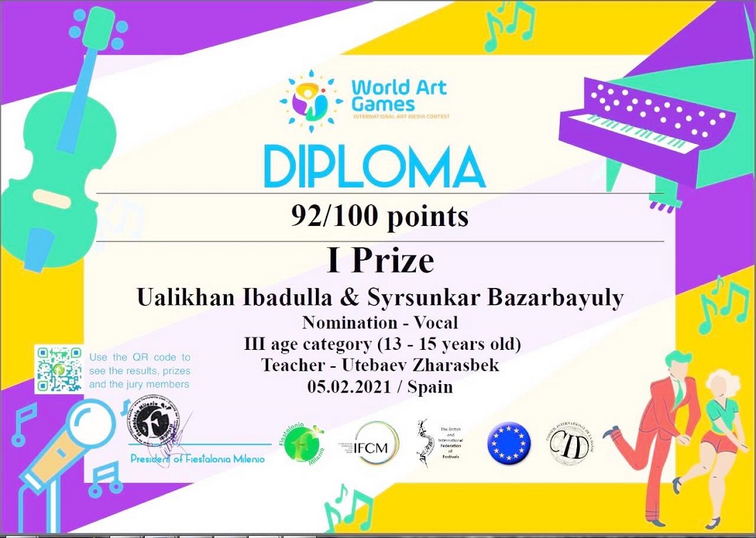 Жиырма мемлекеттің өнерпаздарының басын қосқан бұл көпжанрлы байқауда балалар шығармашылығын белгілі әртістер мен музыканттардан құралған Европаға танымал әділ-қазылар алқасы бағалады. – Жеңімпаз оқушылар – бліммен қатар өнерді алып жүрген мектептің белсенділері. Бірі бұрыннан ән салса, енді бірі мектепке келіп музыкаға ерекше назар аударып, вокалдық дағдыларын дамытуда. Бұл жетістіктері алдағы уақытта жаңа белестерді бағындыруға үлкен сеп болады, – дейді жетекшісі, ән-әуез пәнінің мұғалімі Жарасбек Өтебаев.