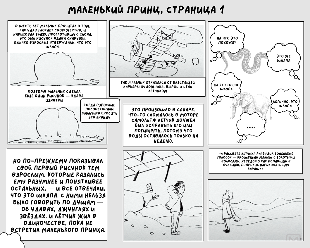 Александр Беляевтің «Человек – амфибия» романы, Николай Заболоцкийдің «Некрасивая девочка» өлеңі, Александр Пушкиннің «Пиковая дама» повесі, Антуан де Сент-Экзюперидің «Маленький принц» повесі, Льюис Кэрроллдың «Алиса в стране чудес» ертегісі секілді әлем әдебиетінің үздік туындыларын зияткерлер комикс тілінде сөйлетті.