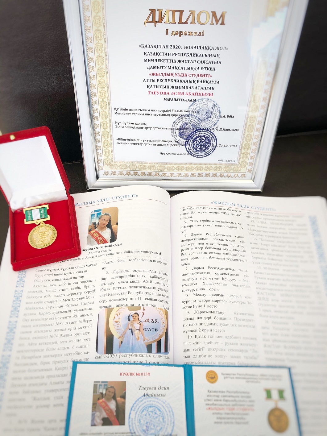 Ғұмарбек Дәукеев атындағы Алматы энергетика және байланыс университетінің АЖ-19-6 (Ақпараттық жүйелер) тобының студенті Тлеуова Әсия да бұл білім бәсекесіне белсене қатысқан болатын. Сынақтардың нәтижесінде ол бірінші дәрежелі Дипломның лауреаты атанып, 2020 жыл бойынша «Жыл студенті» мәртебесін иеленді. Бұл байқаудың мақсаты – үздік студенттердің инновациялық әлеуетін арттыру, жас ғалымдардың зерттеушілік қабілетін дамыта отырып, тәжірибе алмасу. Тәуелсіз қазақ еліне деген құрметті күшейту, патриоттық сезімін арттыру.