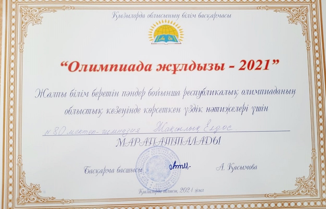 Бұл – оқушы үшін де, сол оқушыны осынау аламан бәйгеге қосқан ұстаз үшін де,қала берді оқу ұжымы үшін де маңызды. Жалпы білім беретін пәндер бойынша республикалық олимпиаданың облыстық кезеңі өзінің жылдағы үрдісі бойынша оқушылардың білімін таразылады. Жыл бойы дайындық жұмыстарымен шұғылданып, еңбек пен төзімділіктің, талап пен дарындылықтың арқасында республикалық олимпиаданың облыстық кезеңі бойынша мектебіміздің 11-сынып оқушысы Жақсылық Елдостың жүлделі бірінші орынды қанжығасына байлаған жеңісі үлкен жетістік болды.