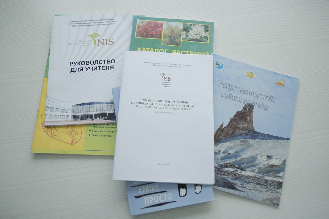 Мұғалімдер «7-9 сынып оқушыларына арналған сыныптан тыс шараларды ұйымдастыру» атты педагогтарға арналған әдістемелік жинақты жасақтап шығарған. – Әдістемелік жинақ кез келген ұстаз үшін маңызды оқу құралдарының бірі екендігі белгілі. Зияткерлік мектептер желісінде тәжірибені трансляциялау, сабақты зерттеу, сабақ үстіндегі оқушылардың іс-әрекеттерін зерттеу дағдылары бізді әдістемелік жинақ жасауға итермеледі. Бұл жинақта сабақтан тыс уақытта балаларды химия пәніне қызықтырып, олармен уақытты тиімді әрі пайдалы өткізуге арналған әдістемелер, ойындар, есептер, тапсырмалар бар, – дейді Айбар Бейбітұлы.