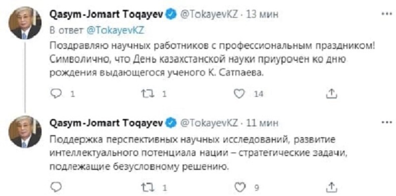«Поздравляю научных работников с профессиональным праздником! Символично, что День казахстанской науки приурочен ко дню рождения выдающегося ученого К. Сатпаева.