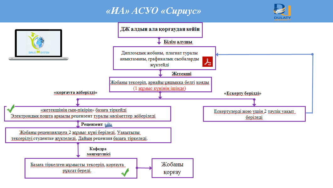 Егер алдын-ала қорғаудың нәтижелері бойынша ескертулер болса, студентке қайта қарау үшін екі күнтізбелік күннен аспайтын уақыт беріледі, содан кейін студентке жұмысты мәліметтер базасына тағы бір рет жүктеуге рұқсат етіледі. Жұмысты тексергеннен кейін жетекші жұмысты рецензиялауға ұсынады. Сонымен бірге студент жұмысын рецензентке электронды пошта арқылы жібереді, ал оң нәтиже алғаннан кейін архивтік файл форматындағы дайын рецензия арнайы өрістегі жұмыс, көмек және кері байланыс үшін мәліметтер базасына тіркейді.
