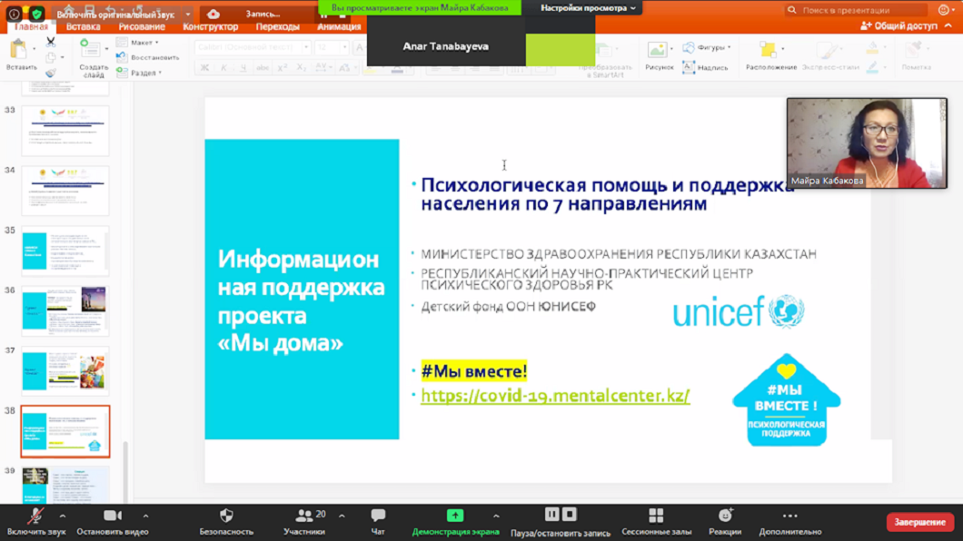 Ол пандемия кезіндегі ажырасу статистикасы туралы айтып, неке мен қарым-қатынасты қалай сақтау керектігі туралы кеңес берді. Спикер барлық мұқтаж жандарға тегін кеңес беру туралы ақпарат берді. Қатысушылар отбасы мәселелерін қызығушылықпен тыңдап, талқылады, сондай-ақ сұрақтар қойды.Вебинар соңында спикер Майра Победовна университет басшылығына және ЮНЕСКО кафедрасына шақырғаны үшін алғысын білдірді, сондай-ақ қатысушыларға ЮНИСЕФ жобасы аясында психологиялық көмек көрсетуге дайын екендігін хабарлады.