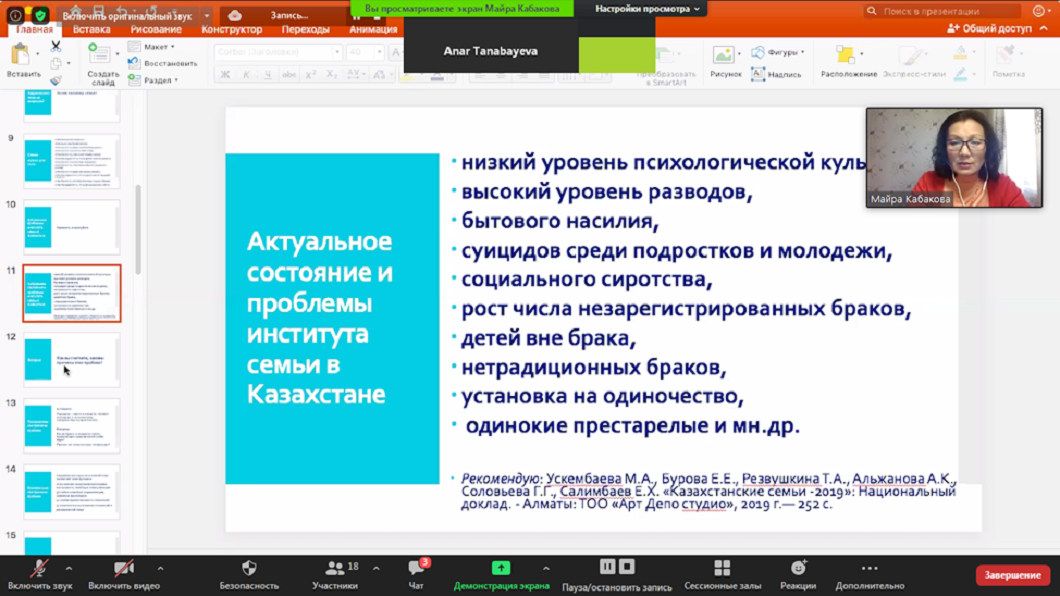 Спикер – Кабакова Майра Победовна, психология ғылымдарының кандидаты, жалпы және қолданбалы психология кафедрасының профессоры, әл-Фараби атындағы ҚазҰУ-нің Отбасылық құндылықтарды зерттеу орталығының директоры «Қазақстандағы Отбасы институты: қазіргі жағдайы мен мәселелері» атты баяндама жасады. Майра Победовна қоғамның ең өзекті мәселелерін атап айтты.