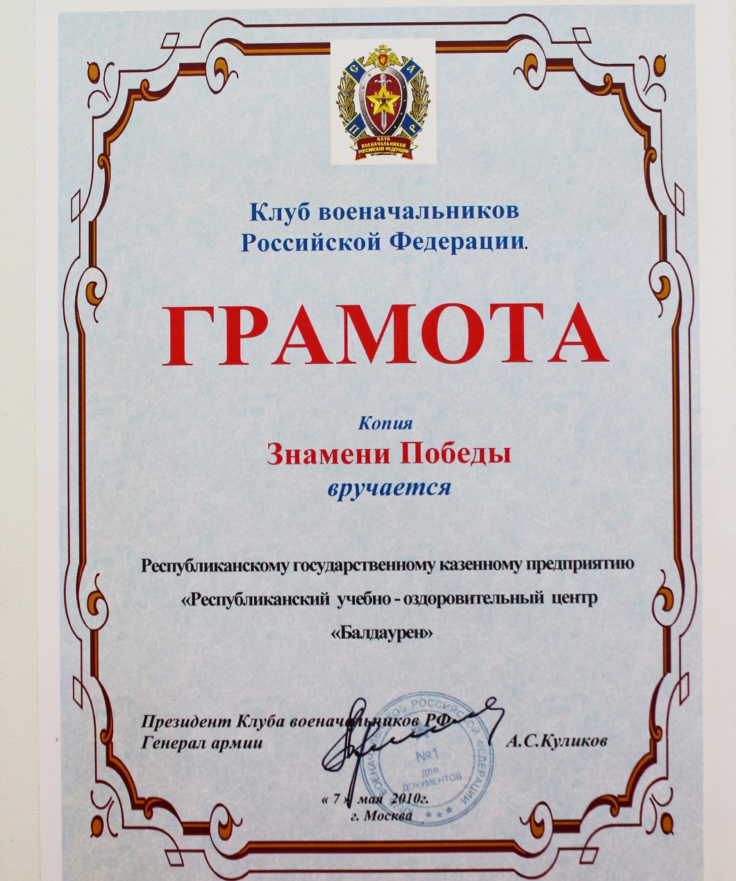 Біздің орталық еліміздегі өскелең ұрпақтың әскери-патриоттық тәрбиесіне үлкен көңіл бөледі. Ресей Федерациясы әскери көшбасшылар клубының (20.12.2011 ж) шешімімен біздің орталық жастарды отаншылдық рухта тәрбиелеуге қосқан үлесі үшін жоғары марапатқа ие болды. «Балдәурен» орталығына Ұлы Отан соғысындағы Жеңіс туының көшірмесі – екінші дәрежелі Кутузов орденімен мараптталғын 150-ші атқыштар дивизиясының шабуыл туы берілді.