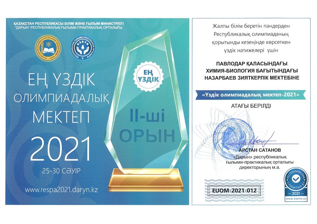 2021 жылғы республикалық олимпиада сәуір айының 25-30 күндері аралығында ұйымдастырылып, NIS оқушылары еліміз бойынша алпы саны 86 медаль жеңіп алды. Жоғары көрсеткіштердің арқасында бірден бірнеше Зияткерлік мектеп республиканың үздік олимпиадалық мектептерінің қатарына енді: бірінші орын – Алматы қаласындағы физика-математика бағытындағы NIS; екінші орын – Павлодар қаласындағы химия-биология бағытындағы NIS; үшінші орын – Ақтөбе қаласындағы физика-математика бағытындағы NIS және Қарағанды қаласындағы химия-биология бағытындағы NIS пен Шымкент қаласындағы химия-биология бағытындағы NIS.