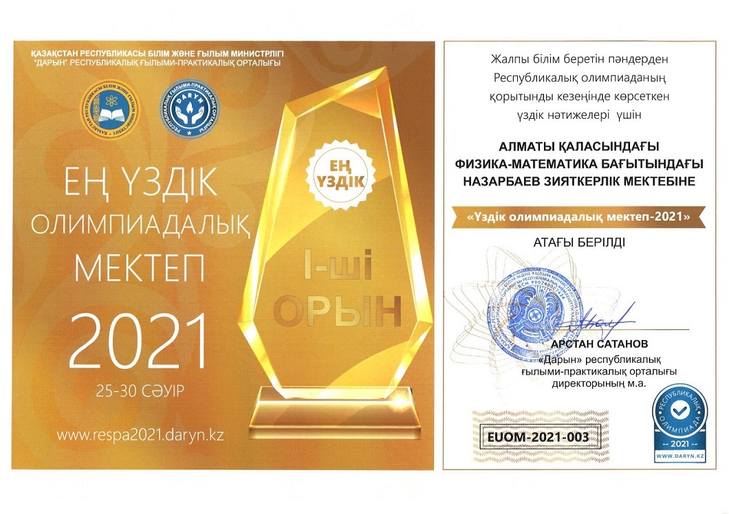 Жалпы білім беретін пәндер бойынша республикалық олимпиаданың қорытындысы бойынша Назарбаев Зияткерлік мектептерінің командасы «Үздік олимпиадалық команда – 2021» аталымы бойынша бірінші орын алды. Жоғары көрсеткіштердің арқасында бірден бірнеше Зияткерлік мектеп республиканың үздік олимпиадалық мектептерінің қатарына енді. Оның ішінде Алматы ФМБ NIS I орын, Павлодар ХМБ NIS II орын, III орынды Ақтөбе ФМБ, Қарағанды ХМБ және Шымкент ХМБ NIS иеленді, – деп хабарлайды оңтүстік астанадағы зияткерлік мектептің баспасөз қызметі.