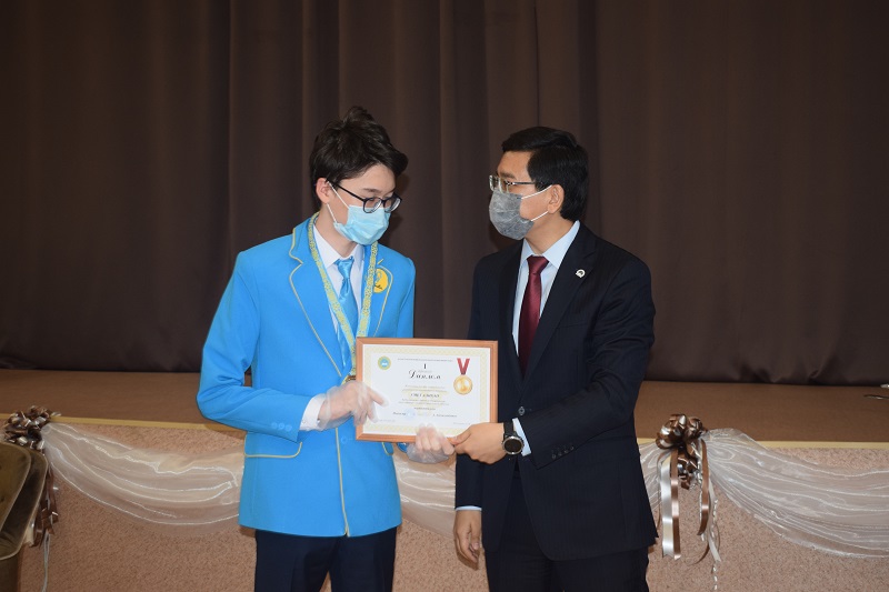 Далее министр в торжественной обстановке наградил медалями и грамотами каждого присутствующего победителя и призера Республиканской олимпиады.