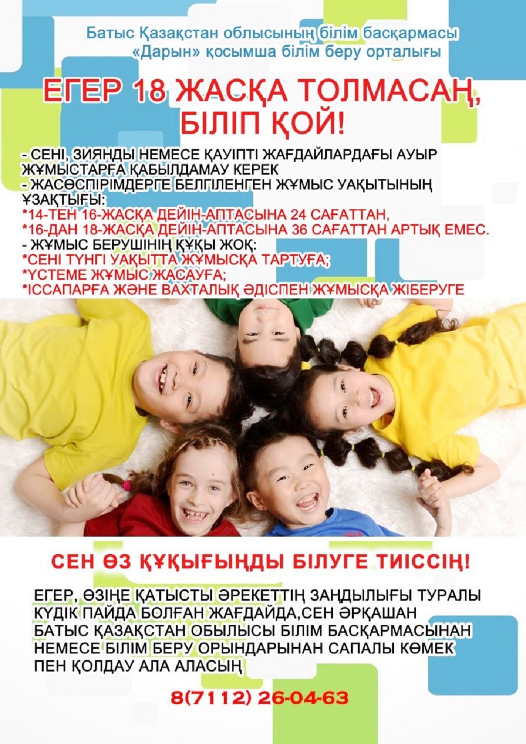 Загрузка...Бала еңбегінің нашар түрлеріне тартылған жағдайда, балаларға қатысты зорлық-зомбылық және қатыгездік көрсетуді алдын алу үшін Батыс Қазақстан облысының білім басқармасының – 8 (7112) 260463 сенім телефоны мен тұрақты жұмыс істейтін облыстық call-орталығына 1301 хабарласа аласыздар.