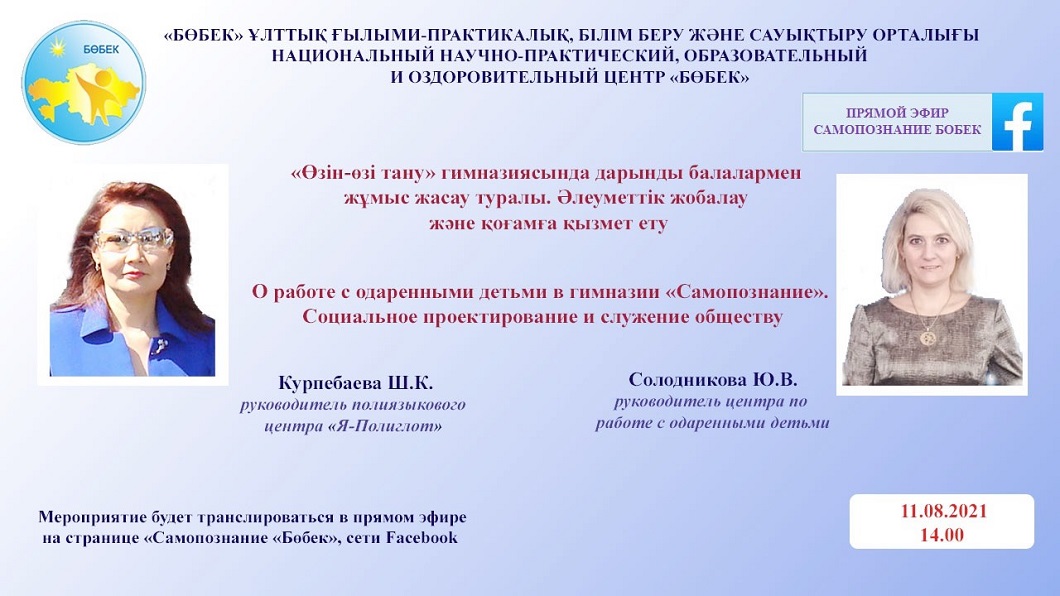 Бүгін, яғни тамыз айының 11-і күні сағат 14.00-де, «Бөбек» ҰҒПББСО «Өзін-өзі тану» гимназиясының «Мен полиглотпын!» көптілдік орталығының басшысы Шәмшия Күрпебаева және гимназияның дарынды балалармен жұмыс жасау орталығының басшысы Юлия Солодникова тікелей эфирде «Өзін-өзі тану гимназиясында дарынды балалармен жұмыс жасау туралы. Әлеуметтік жобалау және қоғамға қызмет ету» тақырыбы бойынша сөз сөйлейді. Іс-шара Фейсбук желісінің «Бөбек» Өзін-өзі тану» парақшасында жарияланады, – деп хабарлайды осы орталықтың баспасөз қызметі.
