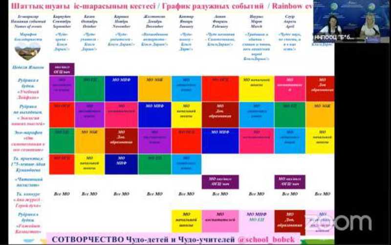 Руководитель полиязыкового центра «Я – полиглот!» гимназии «Самопознание» Центра «Бөбек» Шамшия Курпебаева на трех языках представила «График радужных событий», где было представлено сотворчество «чудо-детей» и «чудо учителей» @school_bobek. «График радужных событий» объединяет всех учителей гимназии «Самопознание» по методическим объединениям.