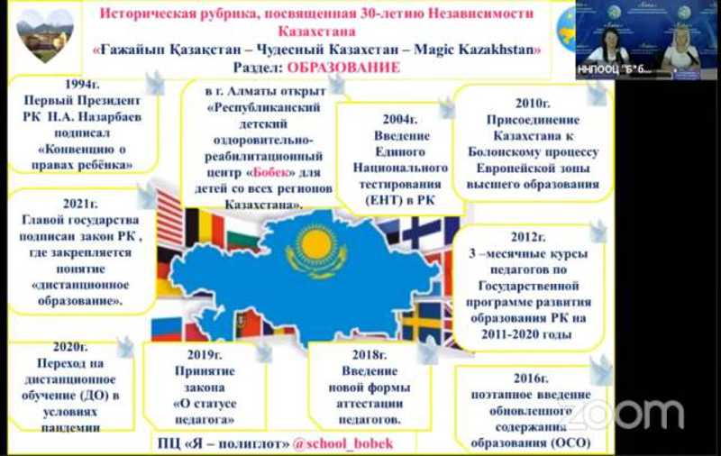 Далее она рассказала о мероприятиях, проводимых полиязыковым центром. Это – «Чудесный Казахстан!», «Чудо врача БлагоДарим!», «Духовного Учителя БлагоДарим!», «Самые интересные учебные лайфхаки!» и другие. Также были проведены творческий проект «Умный кирпичик», посвященный 175-летию великого Абая, композиция «Три воли», посвященная 1 150-летию аль-Фараби, «Ана жүрегі – Герой Духа», посвященный автору программы НДО «Самопознание» Саре Алпысовне Назарбаевой и многие другие мероприятия на казахском, русском и английском языках.