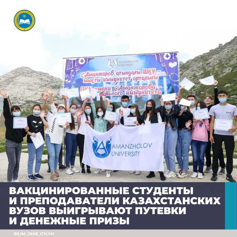 Вакцинированные студенты и преподаватели казахстанских вузов выигрывают путевки и денежные призы. Напомним, ранее по поручению Министра образования и науки РК Асхата Аймагамбетова университеты разработали меры для стимулирования вакцинации среди обучающихся и сотрудников, передает пресс-служба МОН РК.