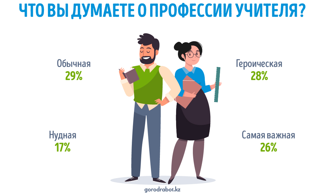 Поисковая система вакансий GorodRabot.kz выяснила ‒ большинство жителей Казахстана считает профессию учителя героической и самой важной.