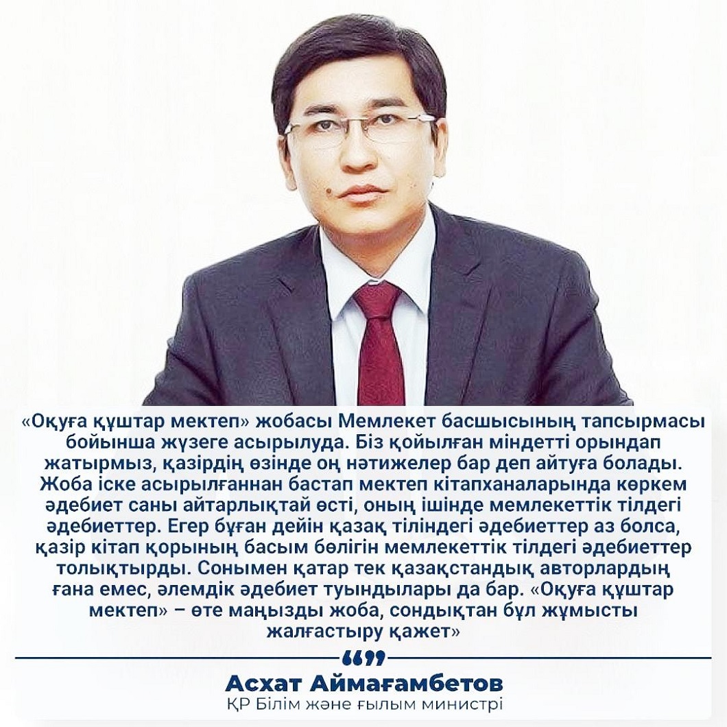 Білім және ғылым министрі Асхат Аймағамбетов «Оқуға құштар мектеп» жобасын жүзеге асырудың маңыздылығын атап өтіп, оқушылардың оқуға деген қызығушылығын арттыру бойынша кешенді жұмысты жалғастыруды тапсырды. «Оқуға құштар мектеп» жобасы Мемлекет басшысының тапсырмасы бойынша жүзеге асырылуда. Біз қойылған міндетті орындап жатырмыз, қазірдің өзінде оң нәтижелер бар деп айтуға болады. Жоба іске асырылғаннан бастап мектеп кітапханаларында көркем әдебиет саны айтарлықтай өсті, оның ішінде мемлекеттік тілдегі әдебиеттер.
