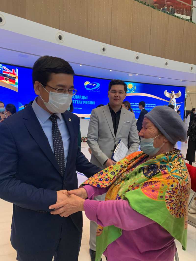 Очень торжественная церемония! По окончании все мы стали свидетелями того, как одна милая әжө подошла к министру образования и науки Askhat Aimagambetov и трогательно говорила слова благодарности за внимание к талантливой молодёжи, детям со стороны Елбасы, Главы государства и Министра! Она пожелала процветания, мира и добра! И никак не хотела фотографироваться, очень скромный человек! Но уже после отъезда Министра вместе с руководителями Библиотеки Елбасы мне удалось познакомиться с замечательной бабушкой одной из победительниц конкурса- Томирис Биржанкызы, ученицы НИШ г. Уральск! Бабушку зовут Маншук Қанапияқызы! И у неё сегодня день рождения! Она дала интервью для сайта Білімді Ел Образованная Страна – скоро разместим! И я узнала, что она обожает свою внучку, ради неё приехала из села и живет в квартире в Уральске, полностью поддерживает девочку и гордится ею! Супер әже!