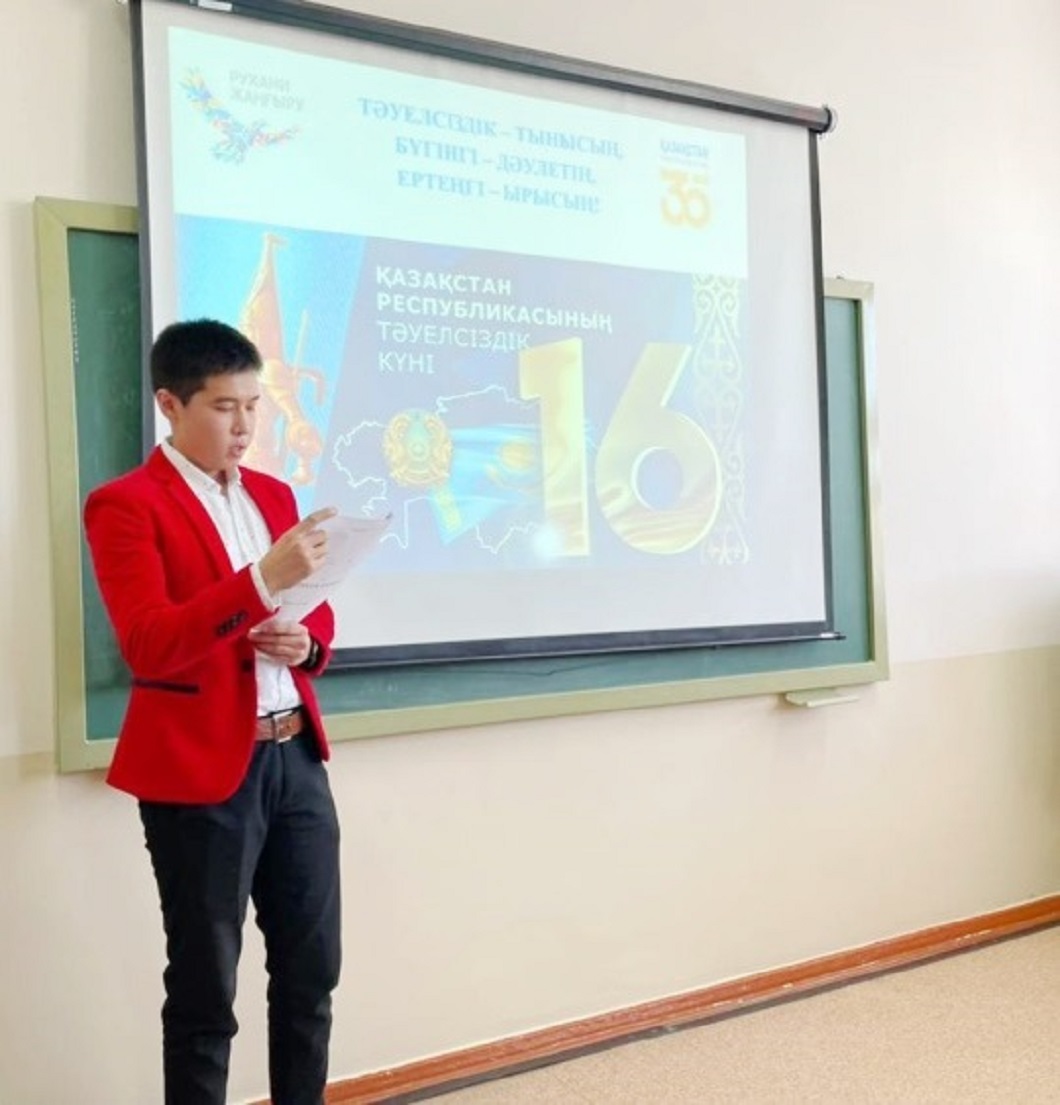 «Ұлттық тәрбие тағылымы» ғылыми-зерттеу үйірмесінің мүшесі, «Серпін» әлеуметтік жобасымен білім алып жатқан ПСК-21-1 тобының студенті Диас Сериков қазақтың қара домбырасымен «Ерке сылқым» күйін тартып іс-шараны ашып берді. «Серпін» әлеуметтік жобасымен білім алып жатқан СИБ-21-1 тобының студенттері Әрінбек Нұрсұлтан, Диас Умиргалиев бабаларымыздың қанымен, білегінің күшімен, найзасының ұшымен келген киелі де қасиетті тәуелсіздіктің қандай қиындықпен келгені туралы жасаған баяндамаларын оқып таныстырды. Ұлық мерекеміздің аясында дербестік жолында еліміздің жүріп өткен қадамдарына назар аударды.