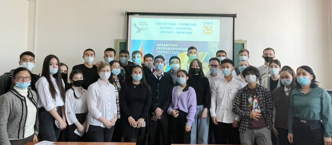 Жақында қазақ тілі және мәдениеті кафедрасының меңгерушісі ф.ғ.к., доцент Қ. Қалыбекованың бастамасымен «Тәуелсіздік – тынысың, бүгінгі – дәулетің, ертеңгі – ырысың!» әдеби-танымдық іс-шара ұйымдастырылды. Бұл басқосуға кафедраның аға оқытушылары п.ғ.м., Г.Сағатова, «Ұлттық тәрбие тағылымы» ғылыми-зерттеу үйірмесінің жетекшісі п.ғ.м., Ғ.Әбілқасов, п.ғ.м., Ш.Жетпісбай және «Мәңгілік ел жастары – индустрияға» – «Серпін» әлеуметтік жобасымен білім алып жатқан студенттер қатысты.