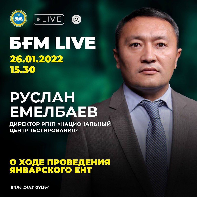«БҒМ LIVE»: 26 января в 15:30 ч. выступит директор Национального центра тестирования