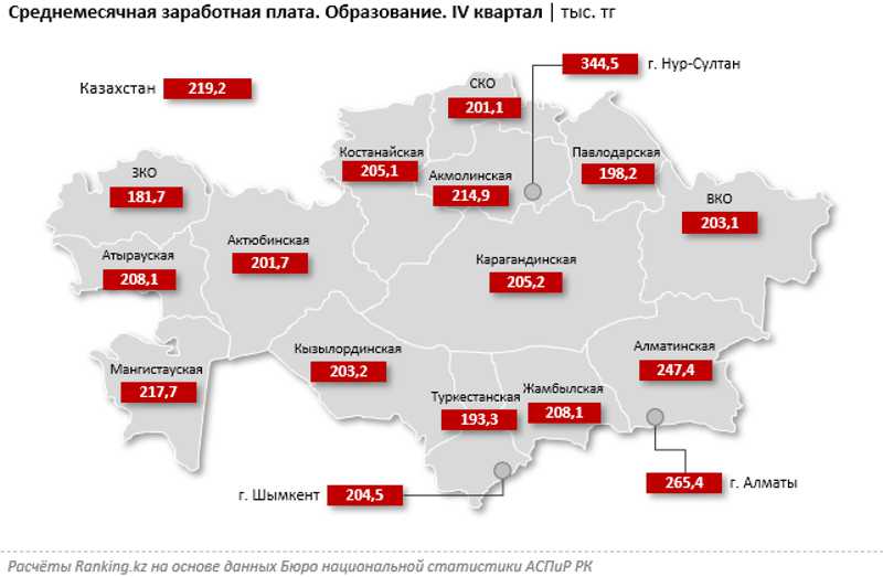 В региональном разрезе больше всего в секторе получают работники столицы: 344,5 тыс. тг — на 15,7% больше, чем годом ранее. В тройке лидеров также оказались Алматы (265,4 тыс. тг) и Алматинская область (247,4 тыс. тг). Меньше всего работники образования получают в Западно-Казахстанской области: 181,7 тыс. тг.