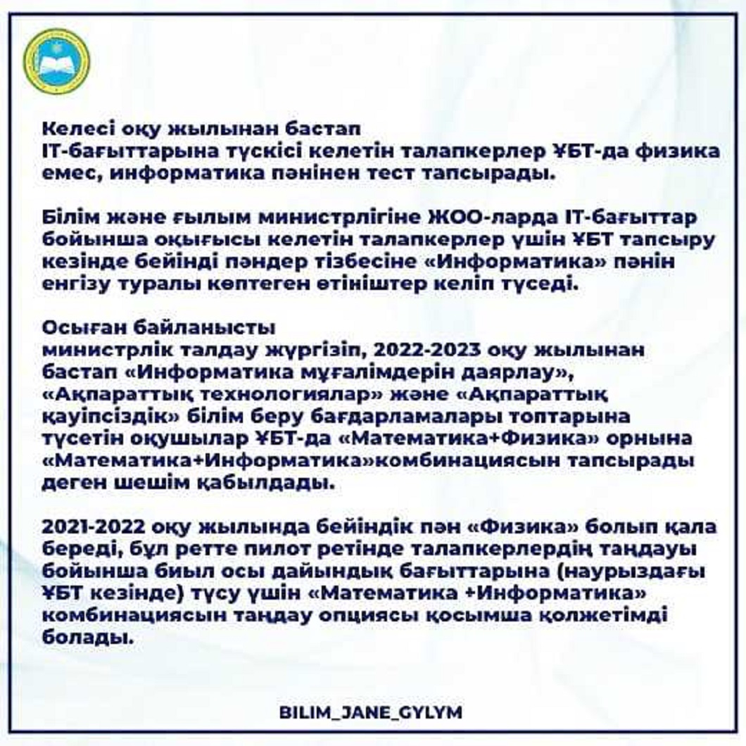 Осыған байланысты министрлік талдау жүргізіп, 2022-2023 оқу жылынан бастап «Информатика мұғалімдерін даярлау», «Ақпараттық технологиялар» және «Ақпараттық қауіпсіздік» білім беру бағдарламалары топтарына түсетін оқушылар ҰБТ-да «Математика+Физика» орнына «Математика+Информатика» комбинациясын тапсырады деген шешім қабылдады.