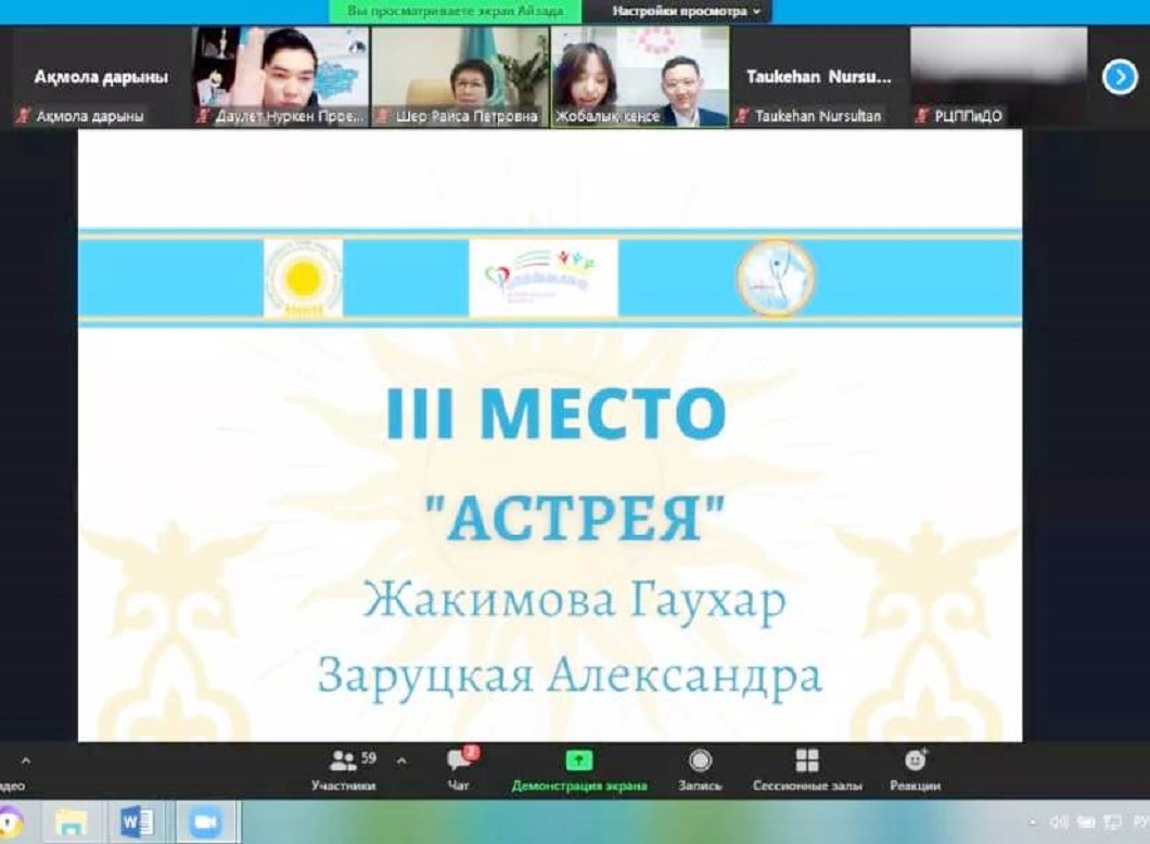 Загрузка...«Ұшқыр ой алаңы» республикалық дебат турнирінің қорытындысына сәйкес «АСТРЕЯ» командасы құрамында Жакимова Гауһар, Заруцкая Александра жүлделі 3 орынға ие болды. Команда мен оның жетекшісін шын жүректен құттықтаймыз! Алар асуларыңыз биік болсын.