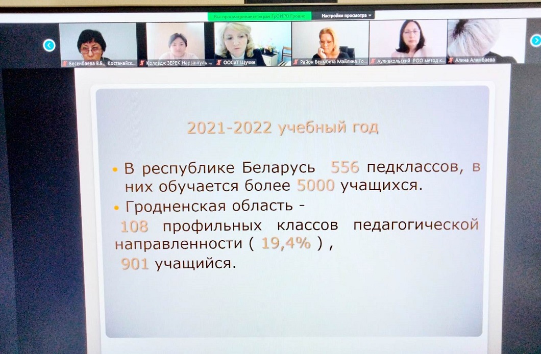 Осы нысанға қызығушылық танытқан Қостанай облысының педагогтары Гродно облысы мектептерінің кәсіптік бағдар беру жұмысын және педагогикалық сыныптардың қызметін бейіндік оқытуды ұйымдастыру жөніндегі тәжірибесімен танысты. Спикер Баркерит Г. Я., педагогика ғылымдарының кандидаты, Гродно облыстық білім беруді дамыту институтының доценті педагогикалық бейіндеудің негізгі тәсілдерімен және нәтижелерімен таныстырды.