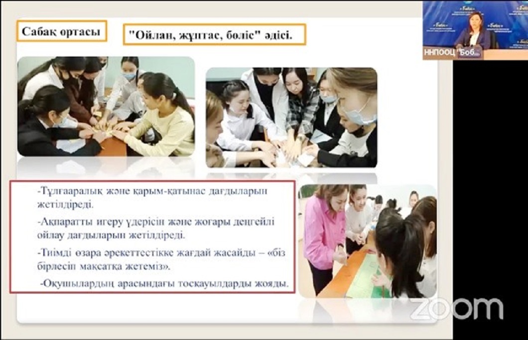 Нақты мақсатқа қол жеткізулері үшін «Ойлан, жұптас, бөліс» әдісі қолданылады. Онда студенттер бір-біріне сенім артып, тыңдап, қолдап, негіздеме жасап, бірлесіп ойларын жинақтауға ынталанып зерттеушілік диалогке түсе алады. Нәтижесінде, тұлғааралық және қарым-қатынас дағдыларынжетілдіріп, тиімді өзара әрекеттестікте команда болып, достық құрмет, көмектесу құндылықтарын дарытып, жоғары деңгейде ойлана алады.