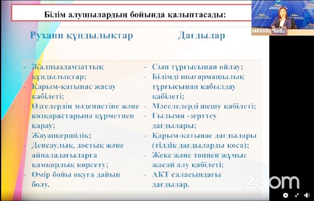 Міне, бір сабақта студенттер біліммен қатар адами ізгі құндылықтарды жинақтап, ересек ретінде мәдениетін қалыптасырады. Қандай білім жинады? Таным процесіне қатысты, сыни ойланады, ынтымақтастық әрекетте топта жұмыс жасайды, шешім қабылдайды. Қандай рухани құндылықтар қалыптастырады? Ж.Аймауытовтың сөзі арқылы жігерленеді, достық қарым-қатынас орнайды, бір-біріне көмек қол созады. Сонымен қатар, ақиқатты ажыратады, сүйіспеншілік сезімдері оянады: білімге деген, мамандығына, достарға деген…