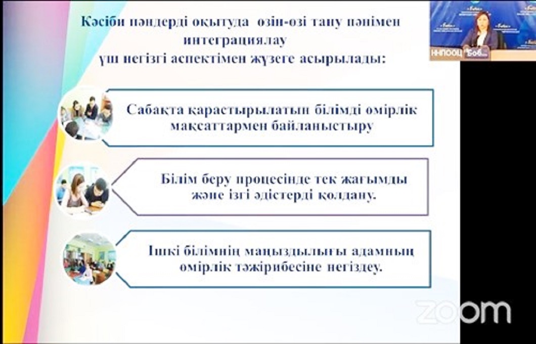 Сол себепті «Өзін-өзі тану пәнін басқа пәнмен интеграциялау өзекті мәселенің бірі болып қала береді. Мәселен, «Өзін-өзі тану» гуманитарлық колледжінде педагогика, психология, педагогикалық шеберлік негіздері, жаңа педагогикалық технология, педагогикалық этика негіздері, ғылыми-педагогикалық зерттеулер әдістемесі кәсіби пәндерін оқытуда өзін-өзі тану пәнімен интеграциялауға болады. Ол үш негізгі аспектіде жүзеге асырылады. Бірінші, сабақта қарастырылатын білімді өмірлік мақсаттармен байланыстыру; Екінші, білім беру процесінде тек жағымды және ізгі әдістерді қолдану.