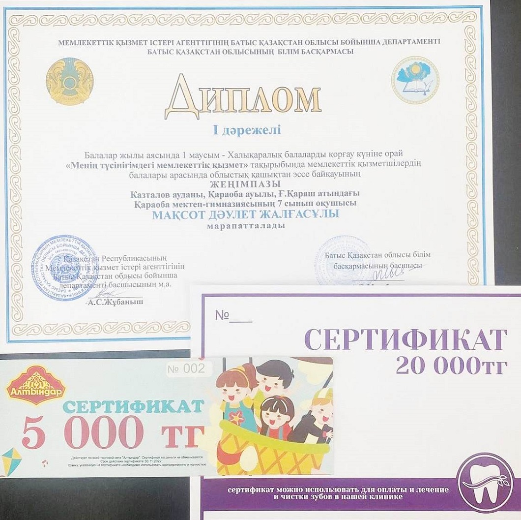 Жеңімпаздарға дипломдар және бағалы сыйлықтар табысталып, басқа да қатысушыларға алғыс хаттар үлестірілді. Бұл байқауға қаржылық қолдау көрсетіп, демеушілік жасаған “Алтындар” супермаркеті желілерінің директоры Барабаш Денис Викторович пен “Батыс Дент” стоматологиясының директоры Мусина Кама Аскаровнаға жиналған жұрттың алғыстан басқа айтары жоқ.