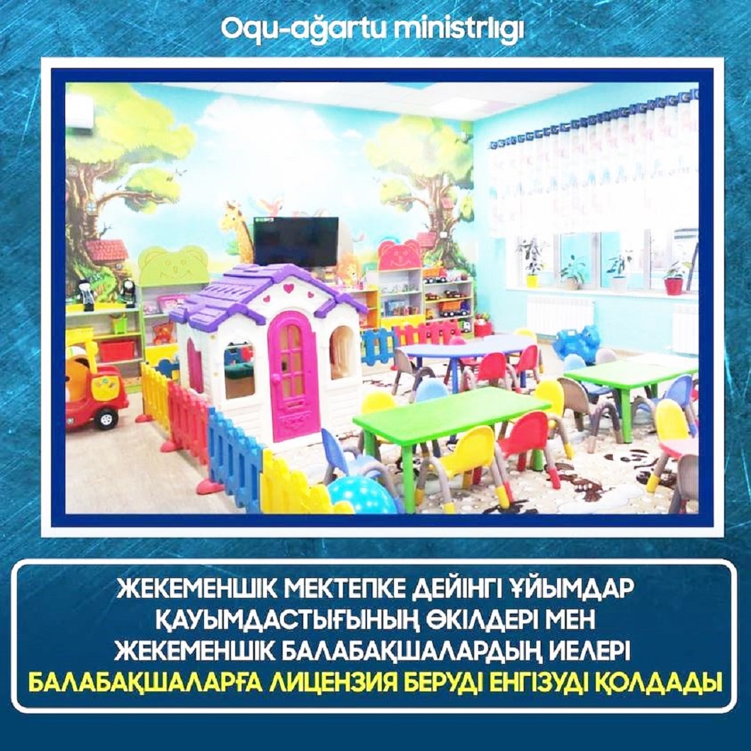 Қазақстанда жекеменшік балабақшалардың иелері мен жекеменшік мектепке дейінгі ұйымдардың республикалық бірлестіктерінің өкілдері лицензия беруді енгізуді қолдады. Олар мұны қажетті шара санайды. Себебі ол балаларды мектепке дейінгі ұйымдардағы зорлық-зомбылықтан қорғап, балабақша тәрбиеленушілеріне жайлы және қауіпсіз жағдай жасауға мүмкіндік береді. Бұл туралы Нұр-Сұлтанда өткен брифингте жекеменшік мектепке дейінгі ұйымдардың иелері мәлімдеді, – деп хабарлайды ҚР Оқу-ағарту министрлігінің баспасөз қызметі.