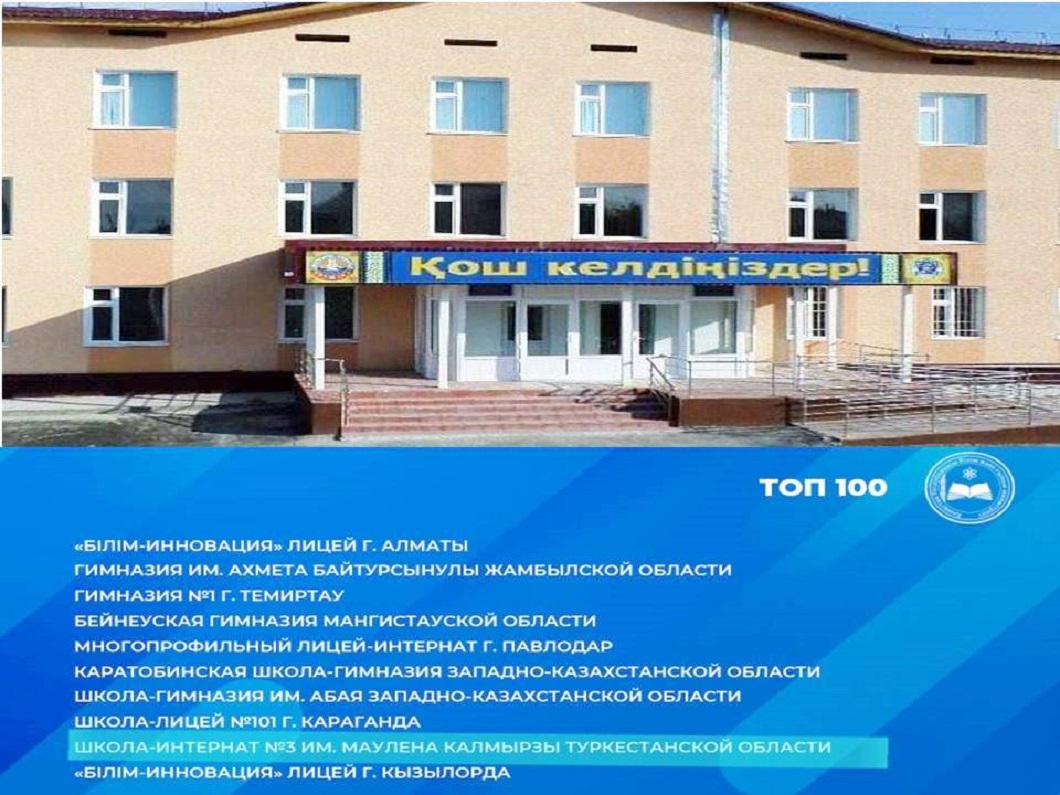2021-2022 оқу жылының қорытындысы бойынша Түркістан облысының адами әлеуетті дамыту басқармасының “Мәулен Қалмырза атындағы №3 мамандандырылған мектеп-интернаты” РЕСПУБЛИКАНЫҢ 100 ҮЗДІК МЕКТЕБІ қатарына енді, – деп хабарлайды осы аймақтағы салалық құрылымның баспасөз қызметі.
