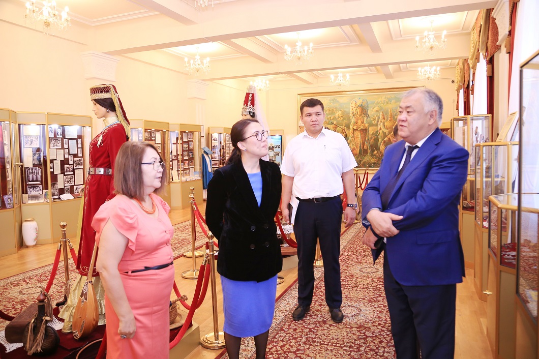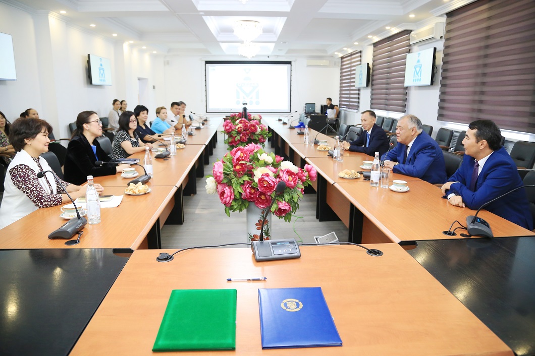 Әріптестерімізді Басқарма Төрағасы – Ректор Гүлмира Әмірханқызы ж2не жаратылыстану институты мен тарих кафедрасының бір топ оқытушы-профессорлар құрамы қарсы алды. Қонақтар Университетіміздің «Ақтұмар » мұражайын, сурет-көрме галереясымен, ондағы студент қыздарымыздың қолөнер бұйымдарымен танысты. Кездесу конференц залында жалғасып, университеттердің презентациялық таныстырылымы көрсетілді.