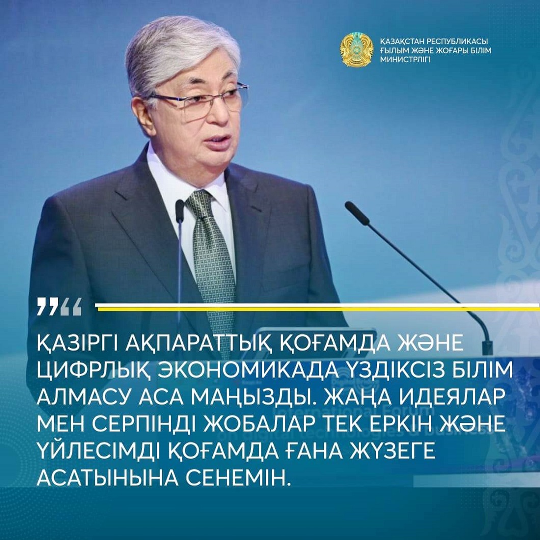 Мемлекет басшысы Қасым-Жомарт Тоқаев «Digital Bridge 2022» халықаралық технологиялық форумында заманауи ақпараттық қоғам мен цифрлық экономика жағдайында кедергісіз білім алмасудың маңыздылығын атап өтті. Осы орайда министрлік тарапынан цифрландыру бағытында жүзеге асырылып жатқан тың жобалар туралы айтып өткім келеді, – деп хабарлайды ҚР Ғылым және жоғары білім министрлігінің баспасөз қызметі.