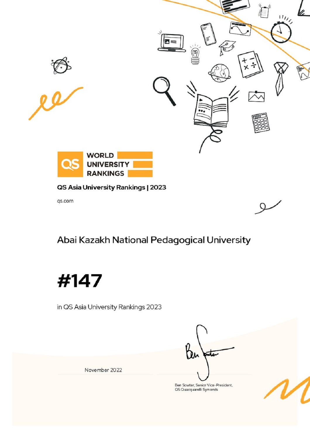 2022 жылдың 8 қарашасында QS World University Rankings: Asia 2023 халықаралық рейтингінің нәтижелері жарияланды, онда Абай университеті 760 қатысушының арасында 147-ші орынды иеленіп, Азиядағы үздік университетінің 20%-на кірді. Абай университеті лайықты нәтиже көрсетіп, Азияның топ-100 университет құрамына жақындады.