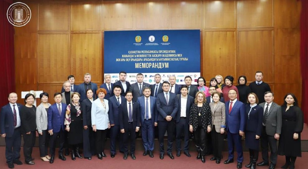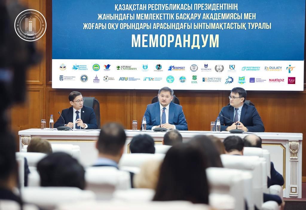 Қазақстан Республикасы Президентінің жанындағы Мемлекеттік басқару академиясы мен «Мемлекеттік басқару», «Мемлекеттік және жергілікті басқару» және «Адами ресурстарды басқару» бағыттары бойынша маман даярлайтын қазақстандық жоғары оқу орындары арасында ынтымақтастық жөніндегі Меморандумға қол қою рәсімі өтті.