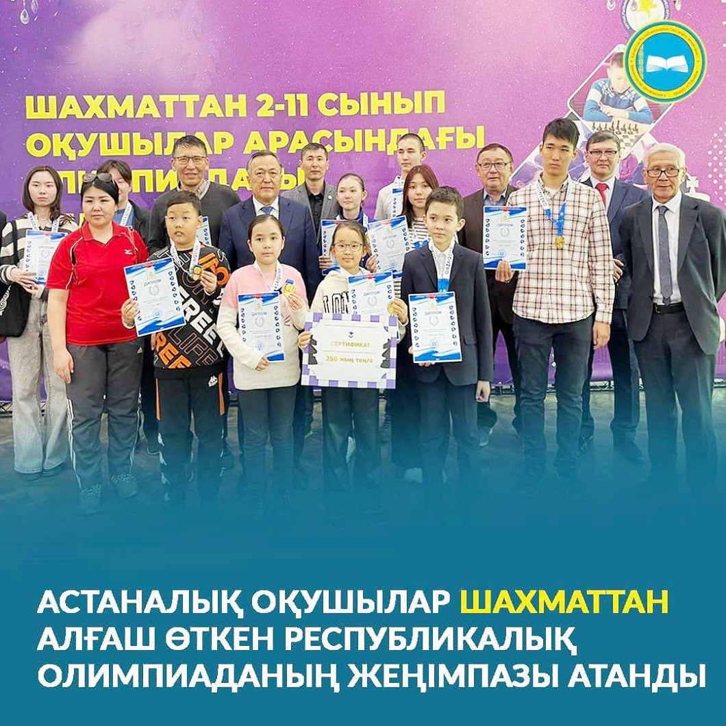 ҚР Оқу-ағарту министрлігінің қолдауымен өткен оқушылар арасындағы шахматтан республикалық олимпиада мәресіне жетті. Жарыстың қорытындысы бойынша бас жүлдені Астана қаласының командасы, екінші орынды Алматы қаласы және үшінші орынды Батыс Қазақстан облысынан келген команда жеңіп алды.