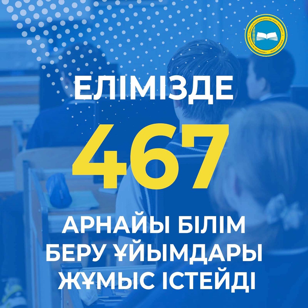 «Арнайы және инклюзивті білім беруді дамытудың Ұлттық-ғылыми практикалық орталығының хабарлауынша, қазіргі күні елімізде 467 арнайы білім беру ұйымдары жұмыс істейді. Оның ішінде арнайы балабақшалар саны – 44, арнайы мектептер саны – 99, ПМПК саны – 93, КППК саны – 209, Оңалту орталықтардың саны – 13, Аутизм орталықтары – 9, – деп хабарлайды ҚР Оқу-ағарту министрлігінің баспасөз қызметі.