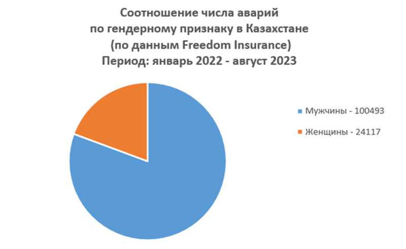 По информации страховой компании со ссылкой на данные ГКБ, в Казахстане мужчины в 4,1 раза чаще попадают в ДТП, чем водители-женщины. Так, с января 2022 года по август 2023 года включительно страховая компания зафиксировала 100 493 аварии, где водителем был мужчина, и 24 117 аварии, где виновником ДТП стала женщина.