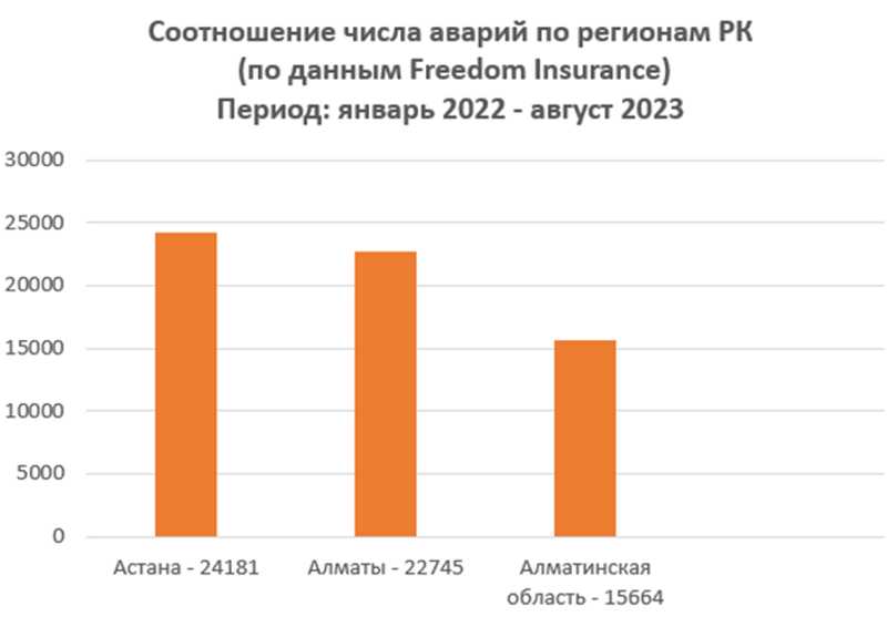 Также, по данным страховой компании, на дорогах Астаны с января 2022 года по август 2023 года включительно произошел 24 181 страховой случай, а в Алматы – 22 745. Несмотря на это, общий размер страховых выплат за тот же период в Астане составил 11,1 млрд тенге, в Алматы же – 13,2 млрд. Специалисты отмечают, что это может быть связано со стоимостью автомобилей, которые стали участниками ДТП, а также от вида страховки, которую предлагает компания. Третьей группой по количеству страховых случаев, по данным специалистов страховой компании, стали автомобили, зарегистрированные в Алматинской области – 15 664. Выплаты по страховым случаям с их участием составили 10,8 млрд тенге.