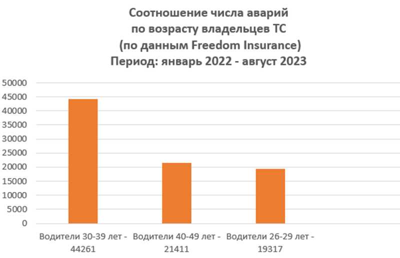Самой «аварийной» категорией автовладельцев, по данным Freedom Insurance, являются водители в возрасте 30-39 лет. Эта группа попадала в аварии чаще всех – 44 261 раз за вышеуказанный период. Категория автовладельцев, которые старше на 10 лет – 40-49 лет, заняли вторую строчку рейтинга частоты попадания в ДТП – 21 411 случаев. Третье место по частоте попадания в ДТП досталось автовладельцам в возрасте от 26 до 29 лет – 19 317 случаев.